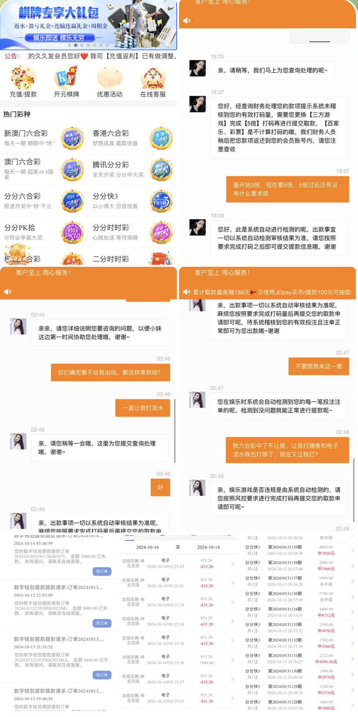 事情的经过就是周六在其平台充值然后购买了六合彩,中了15000左右,结果去提现的时候就不让提,直接退回,咨询客服,客服说流水不够,需要彩票打3倍流水,因为是老客户,就没寻思他们会搞这些,当我3倍流水完成后又说流水不够必须去捕鱼打5倍流水,当我完成后又让我去电子打5倍流水,我操你妈了个逼,这个平台是我见过最垃圾的平台,没有钱玩不起你就不要开信誉盘啊,这点钱你都黑?又不是第一天在你们平台玩,你们活不起了吗?输的只有8000块钱提款3000你也是不出,我干你奶奶个逼,他们肯定不止黑了一个会员,希望大家擦亮眼睛!