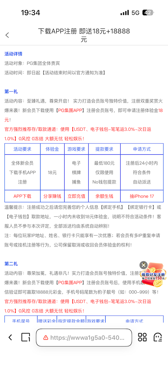 到账情况:自测【充值后果自负】 领取方式:下载注册完善信息送18 安全系数:低 平台资历:未知 会员评分:★☆☆☆☆ 申领网址:https://146.103.87.91:5001/ 提现要求:最低提现额度为100元